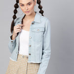 Light Blue Denim Raw Edge Crop Jacket, in Denim fabric, Unlined, Cropped Length, Comfort Fit, Button Closure, Straight Hemline and features Denim Washed Garment
