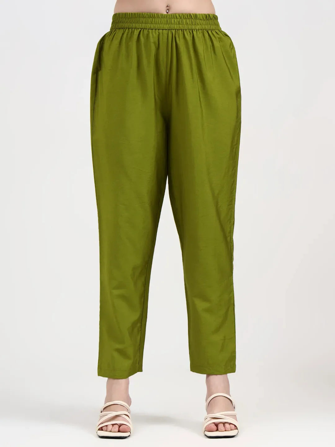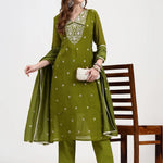 Lime Green Mul Chanderi Thread Work Sequins Work A-Line Kurta Trouser Dupatta Set