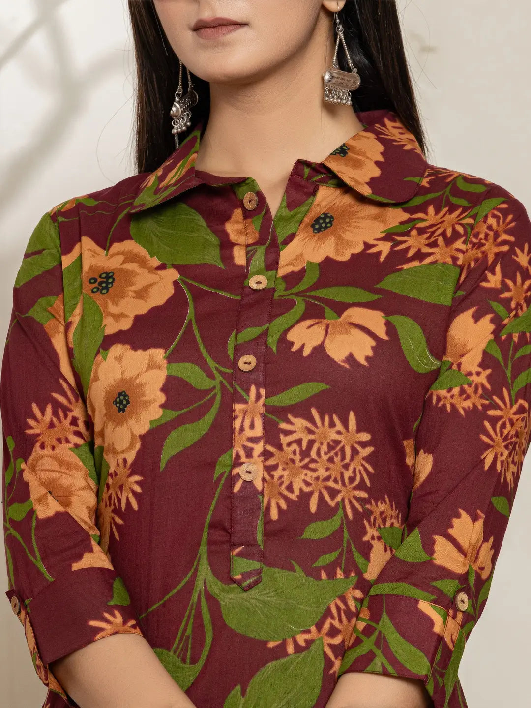 Maroon, Yellow & Grey Printed Top , has Shirt Collar, Three Quarter sleeves, full placket closure and regular waist hem