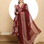 Maroon Floral Print A-Line Kurta Trouser Dupatta Set
