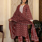 Maroon Floral Print Pakistani Style Kurta Trouser And Dupatta Set