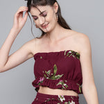 Maroon Floral Tube Top, in Polyester fabric, Polyester Lining, Crop Length, Comfort Fit, Zipper Closure, Flared Hemline and features Frill Detail At Hem