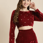 Maroon Full Sleeve Embroidered Velvet Crop Top