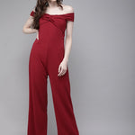 Maroon Off Shoulder Jumpsuit, in Polyester Spandex fabric, Unlined, Full Length, Comfort Fit, No Closure, Straight Hemline and features Off Shoulder Neck