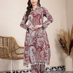 Maroon Paisley Print Pure Cotton Tunic And Trouser CO-ord Set Kurta design:Paisley Print Tunic A-line shape Shirt Collar,Long sleeve(Cuffed Sleeves) Straight hem with Cotton Lining Top Pure Cotton machine weave, Trouser design:One Pocket Trouser Elasticated waistband Slip-on closure Material & Care Top Fabric Pure Cotton Bottom Fabric Pure Cotton