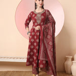 Maroon Pure Cotton Thread Work Anarkali Kurta Dupatta Pant Set