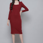 Maroon Rib Puff Sleeves Square Neck Bodycon Dress