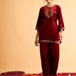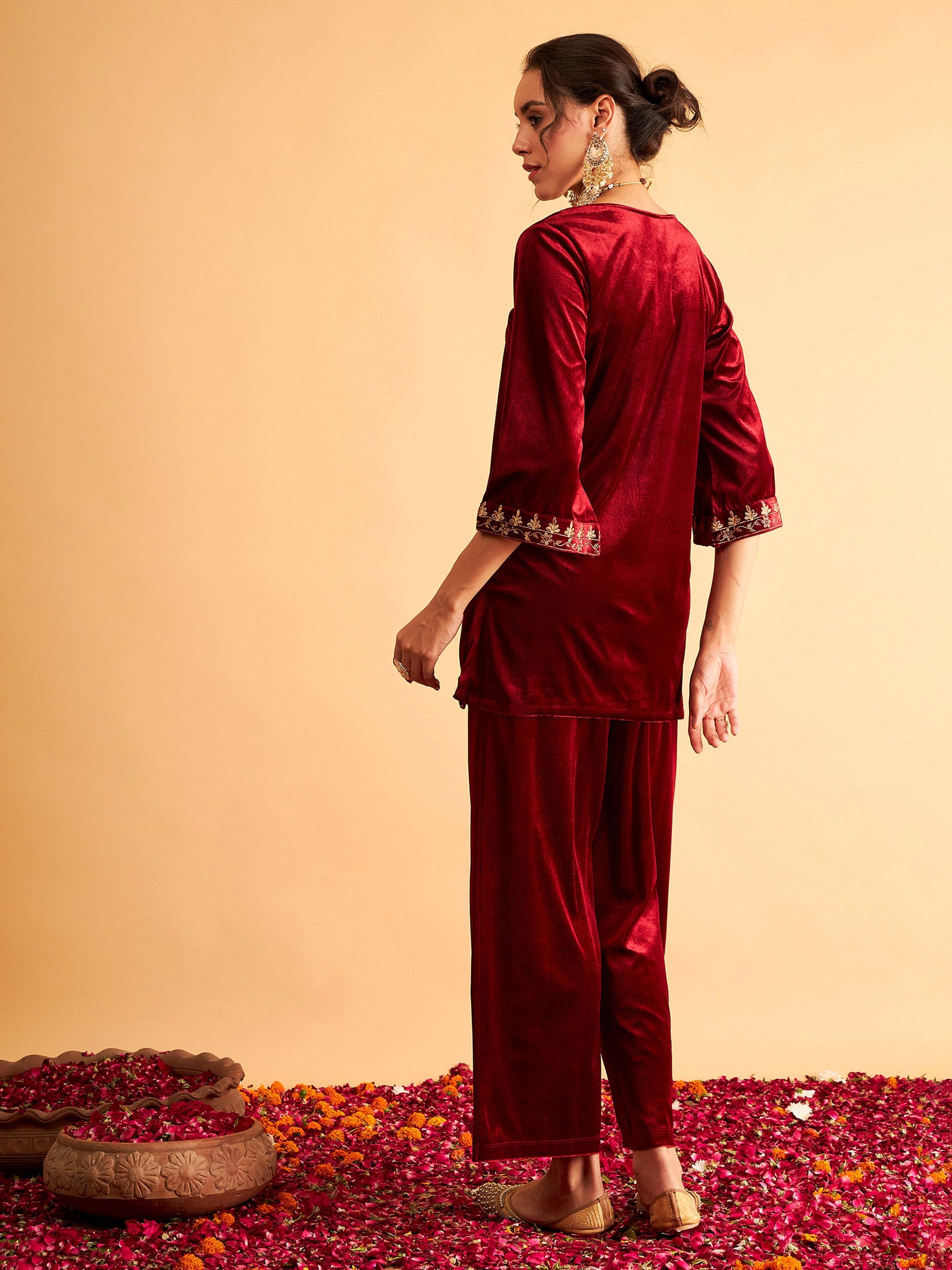 Maroon Velvet Zari Embroidered Short Kurta, in Velvet fabric, Cotton Lining, Above Knee, Comfort Fit, NA, Straight Hemline and features Zari Embroidery At Front & Sleeve Opening