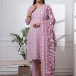 Mauve Ethnic motifs Print Straight kurta Trouser Dupatta Set Kurta Design Ethnic motifs,Thread Work Straight Shape Three quarter sleeve Round Neck Calf Length Kurta Straight Hem Side Slits Machine Weave Cotton Trouser Design:One pocket Pure Cotton Trouser Slip-On Waist Size & Fit Material & Care Pure Cotton Dry Clean