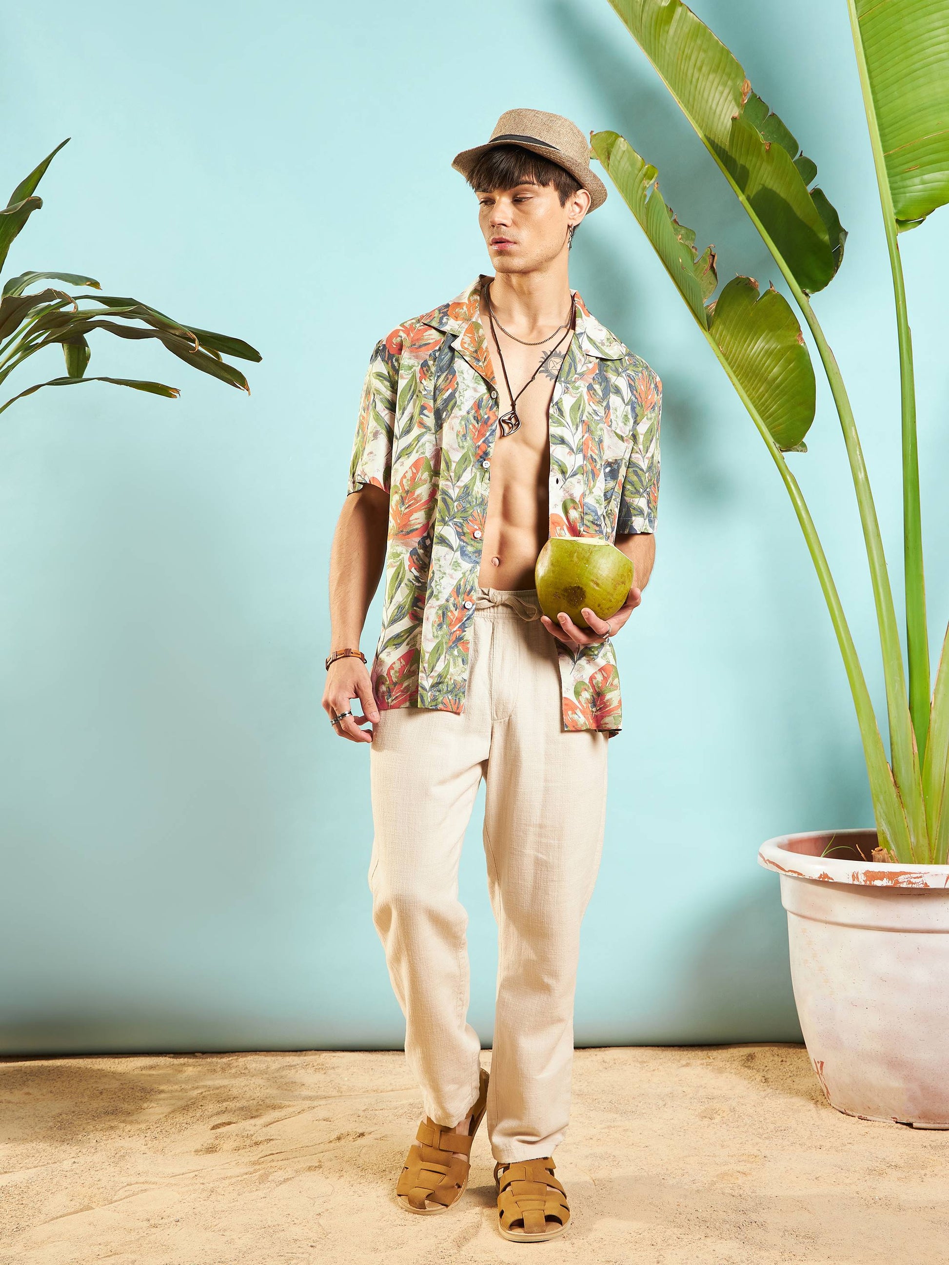Men Beige Tropical Print Relax Fit Shirt