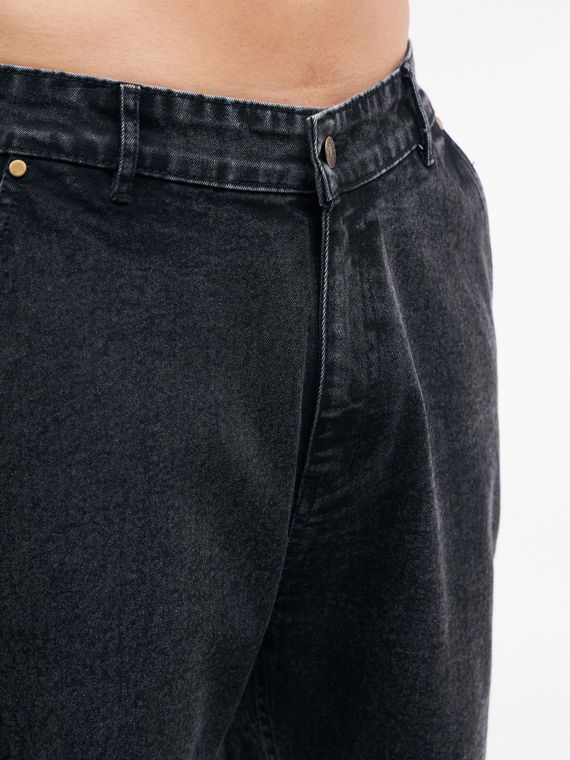 Black Relax Fit Denim Shorts, in Cotton fabric, Unlined, Above Knee, Relax Fit, Button Closure, Straight Hemline and features Strap Detailing