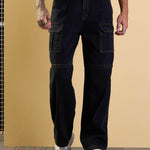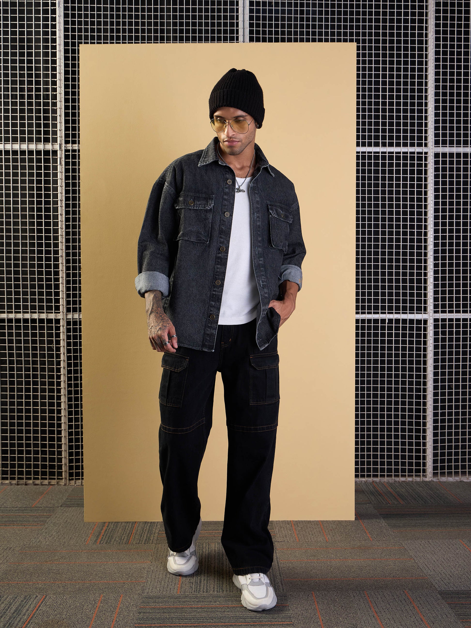 Black Side Pocket Baggy Cargo Jeans, in Denim fabric, Unlined, Ankle Length, Baggy Fit, Button Closure, Straight Hemline and features Box Pocket At Side