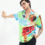Men Blue Art Print Short Sleeves Satin Shirt