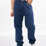 Blue Knee Slit Relax Fit Jeans, in Cotton fabric, Unlined, Ankle Length, Relax Fit, Button Closure, Straight Hemline and features Slit At Knee