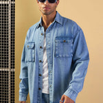 Blue Washed Denim Oversize Shacket, in Denim fabric, Unlined, Regular length, Oversize Fit, Button Closure, Curve Hemline and features Box Pockets At Chest