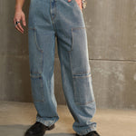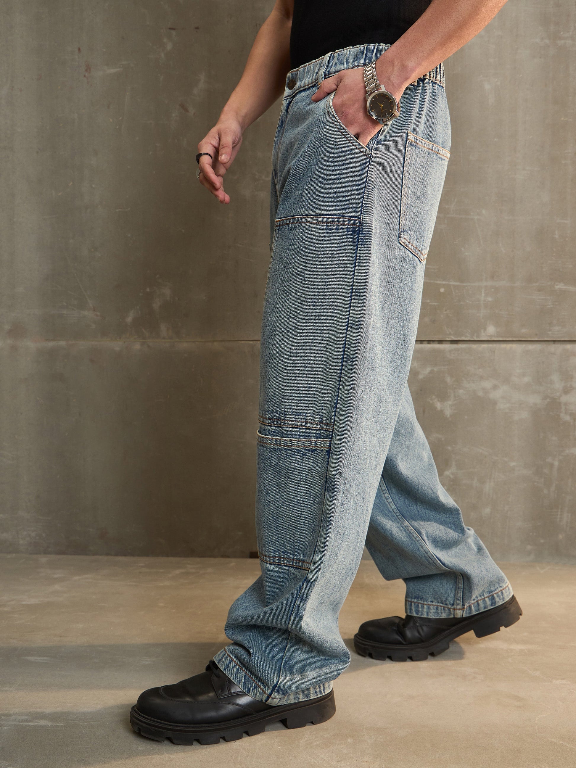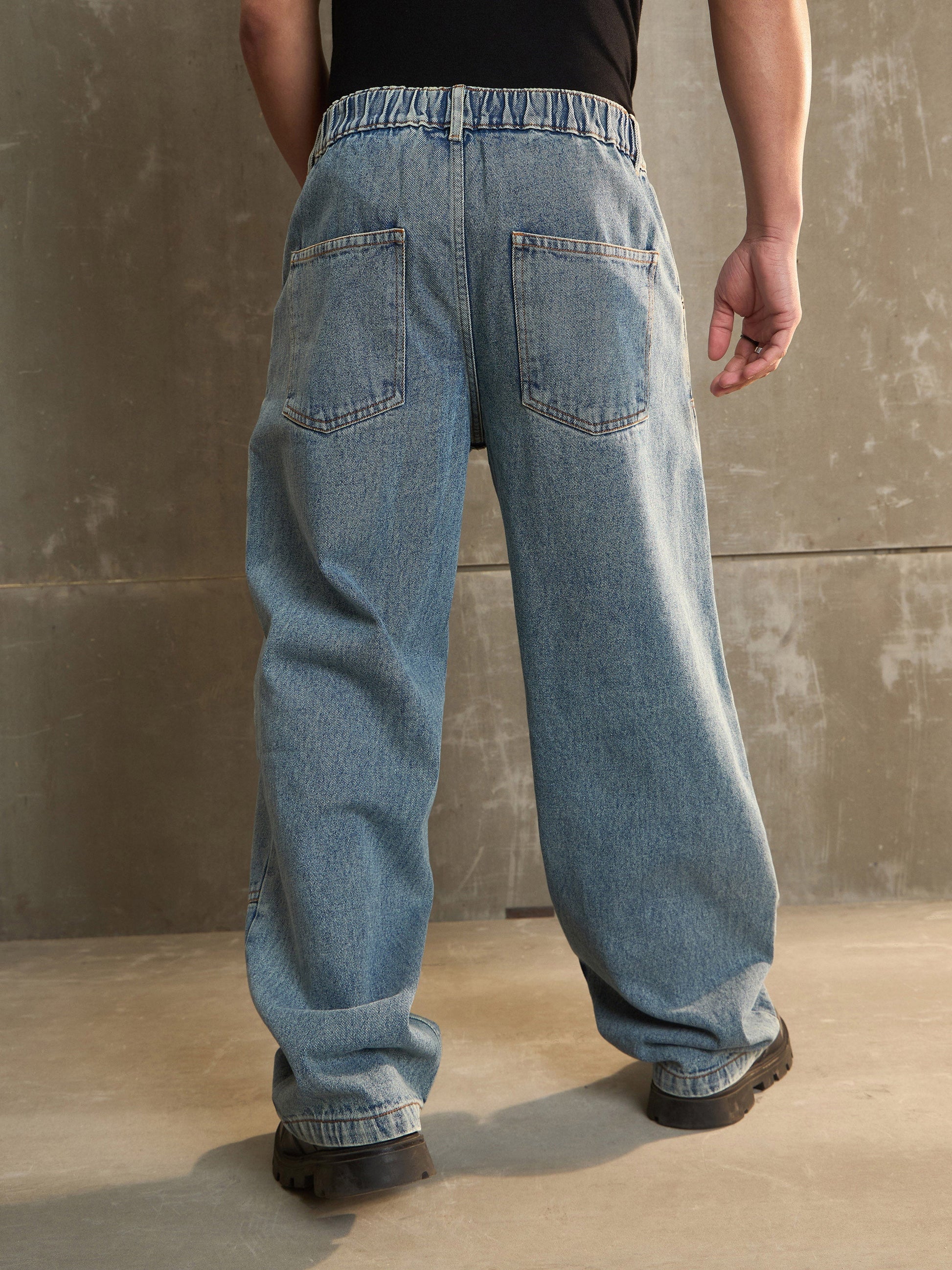 Blue Washed Wide Leg Carpenter Jeans, in Denim fabric, Unlined, Full Length, Baggy Fit, Button Closure, Straight Hemline and features Elasticated Waistband