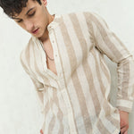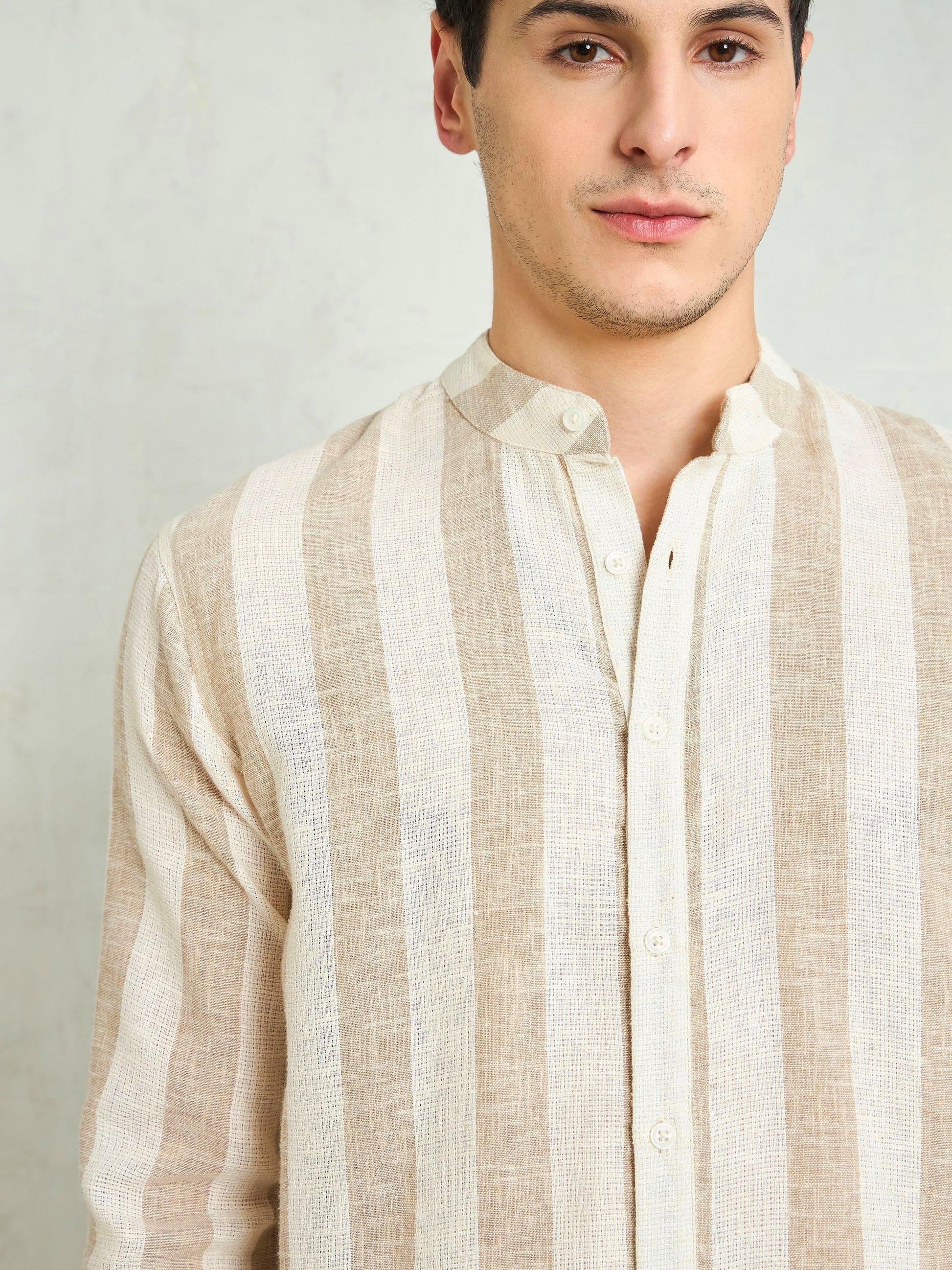 Brown & Beige Cotton Stripes Mandarin Collar Relax Fit Shirt, in Linen Blend fabric, Unlined, Regular length, Relax Fit, Button Closure, Curve Hemline and features