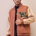 Brown & Beige NEVER SETTLE Embroidery Varsity Jacket, in Fleece fabric, Unlined, Regular length, Relax Fit, Button Closure, Straight Hemline and features Towel Embroidery At Front