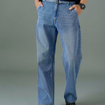 Men Light Blue Wash Front Belted Relax Fit Jeans