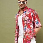 Red Tropical Floral Oversized Shirt, in Rayon fabric, Unlined, Regular length, Oversized, Button Closure, Straight Hemline and features Button Detail At Front