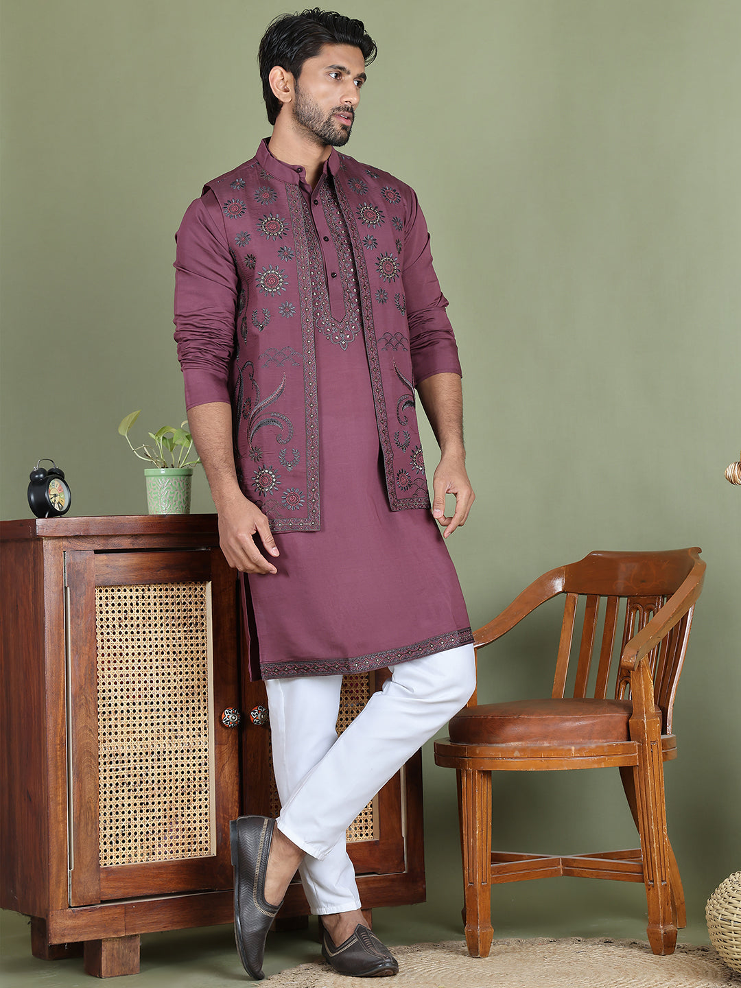 Embroidered Waistcoat & Solid Kurta Pyjama For Men