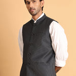 Navy Striped Woven Nehru Jacket For Men