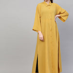 Mustard Button Placket Longline Shrug, in Crinkle Crepe fabric, Unlined, Full Length, Comfort Fit, Button Closure, Flared Hemline and features Loose Fit Long Shrug