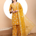 Mustard Cotton Lace Work Kurta Set With Pant & Dupatta