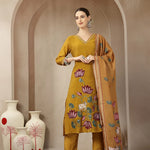 Mustard Mul Chanderi Silk Floral A-Line Kurta Trouser Dupatta Set
