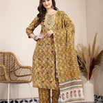 Mustard Pure Cotton Lace Work On Yoke Straight Kurta Dupatta Pant Set