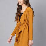 Mustard Waterfall Shrug With PU Tie Belt, in Rivera Crepe fabric, Unlined, Above Knee, Comfort Fit, No Closure, Straight Hemline and features PU Drawstring Detail At Waist