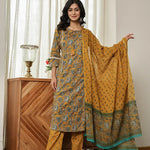Mustard Yellow Floral A-Line Kurta Trouser Dupatta Set With Lace Work