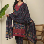 Navy blue, maroon and yellow printed kurta with trouser and dupatta