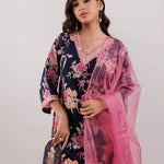 Navy Blue Floral Print Cotton Straight Kurta Trouser With Dupatta Set
