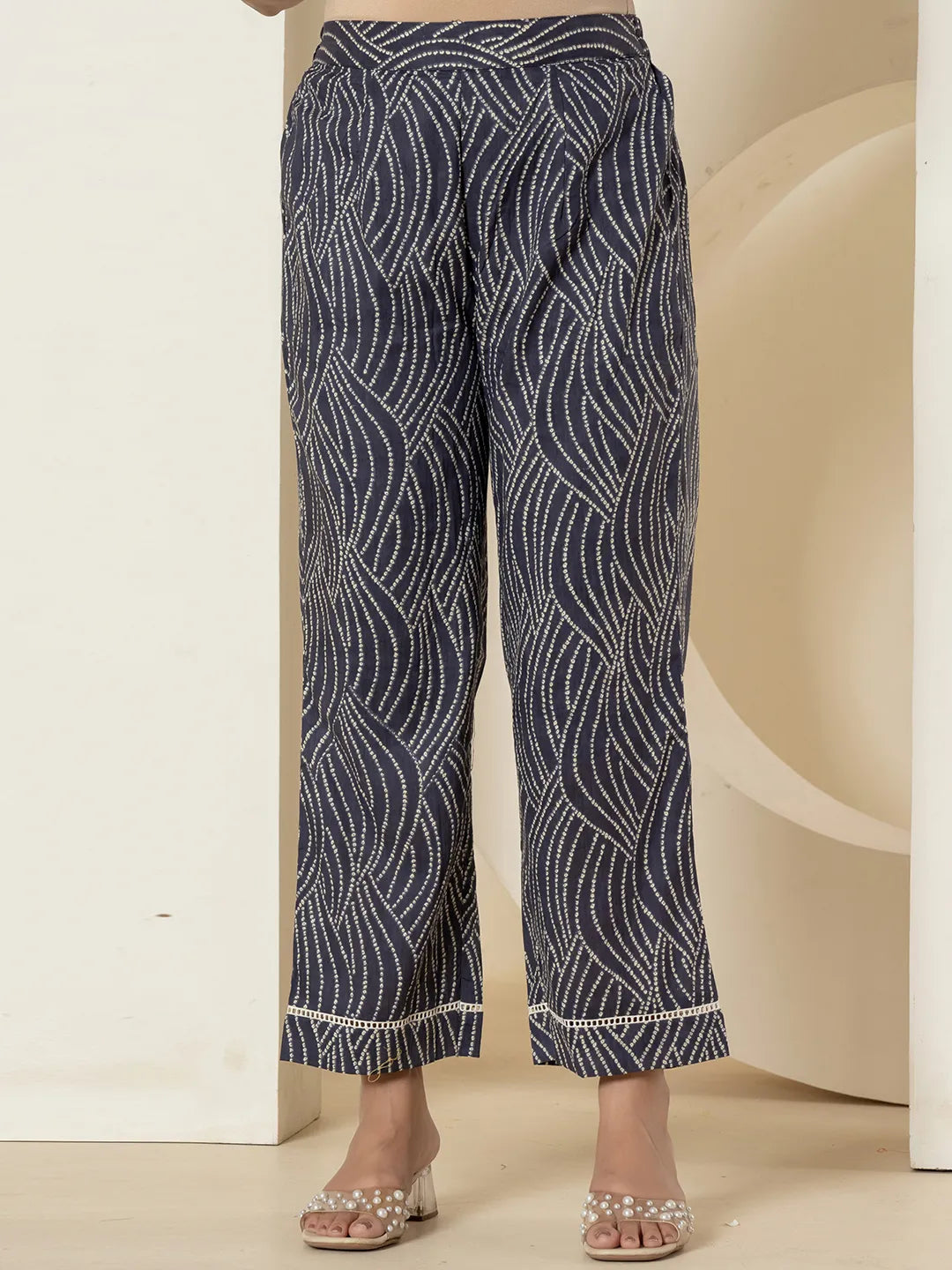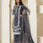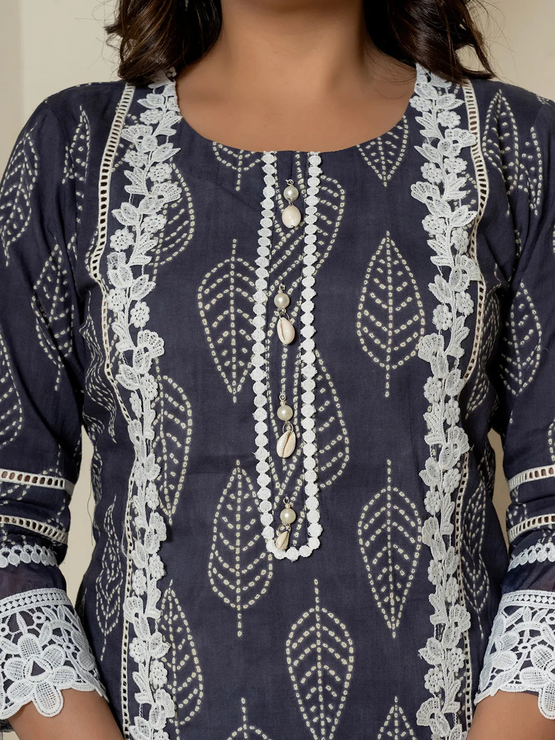 Navy Blue Patch Work Pure Cotton Straight Kurta And Trouser with dupatta Set
