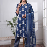 Navy Blue Pure Cotton Floral Thread Work Kurta Dupatta Pant Set