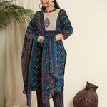 Navy Blue Pure Cotton Kantha Work Kurta Dupatta Pant Set With Hand Block Yoke