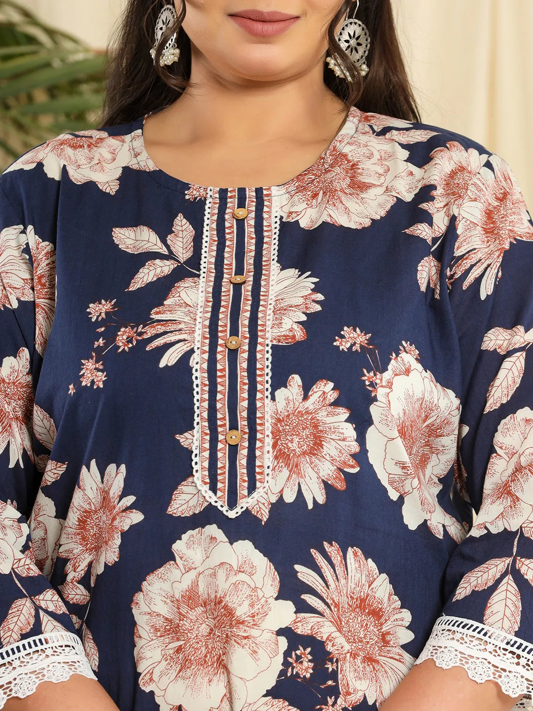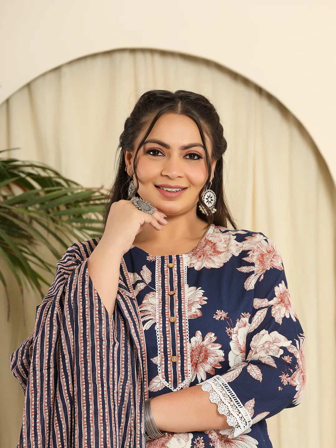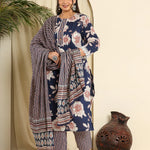 Navy Blue Pure Cotton Kurta Dupatta Pant Set With Handwork