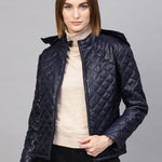 Navy Quilted Hooded Puffer Jacket, in Polyester fabric, Polyester Lining, Regular Length, Comfort Fit, Zipper Closure, Straight Hemline and features Quilting On Jacket