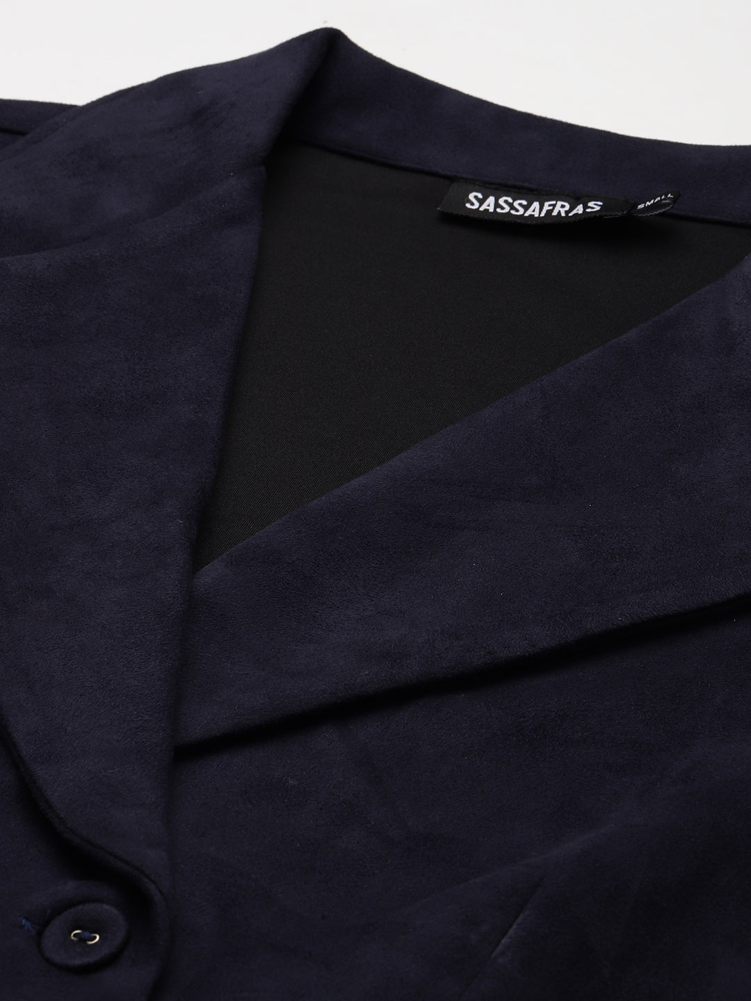 Navy Suede Crop Blazer, in Suede fabric, Unlined, Crop Length, Comfort Fit, Button Closure, Straight Hemline and features Laundary Button Detail At Front