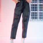 Navy Washed High Waist Distressed Knee Jeans, in Denim fabric, Unlined, Full Length , Comfort Fit, Button Closure, Straight Hemline and features Distress Detail At Knee