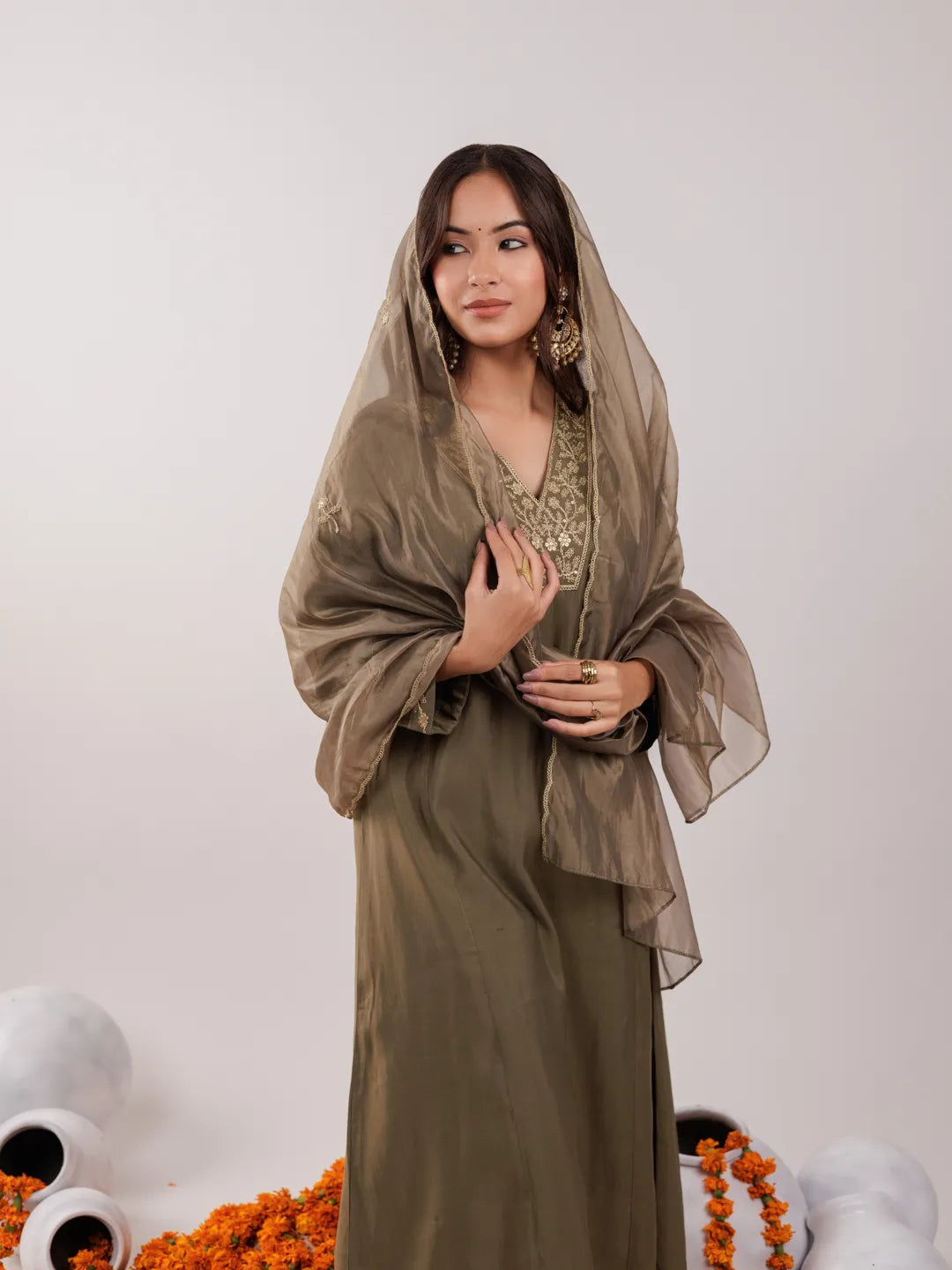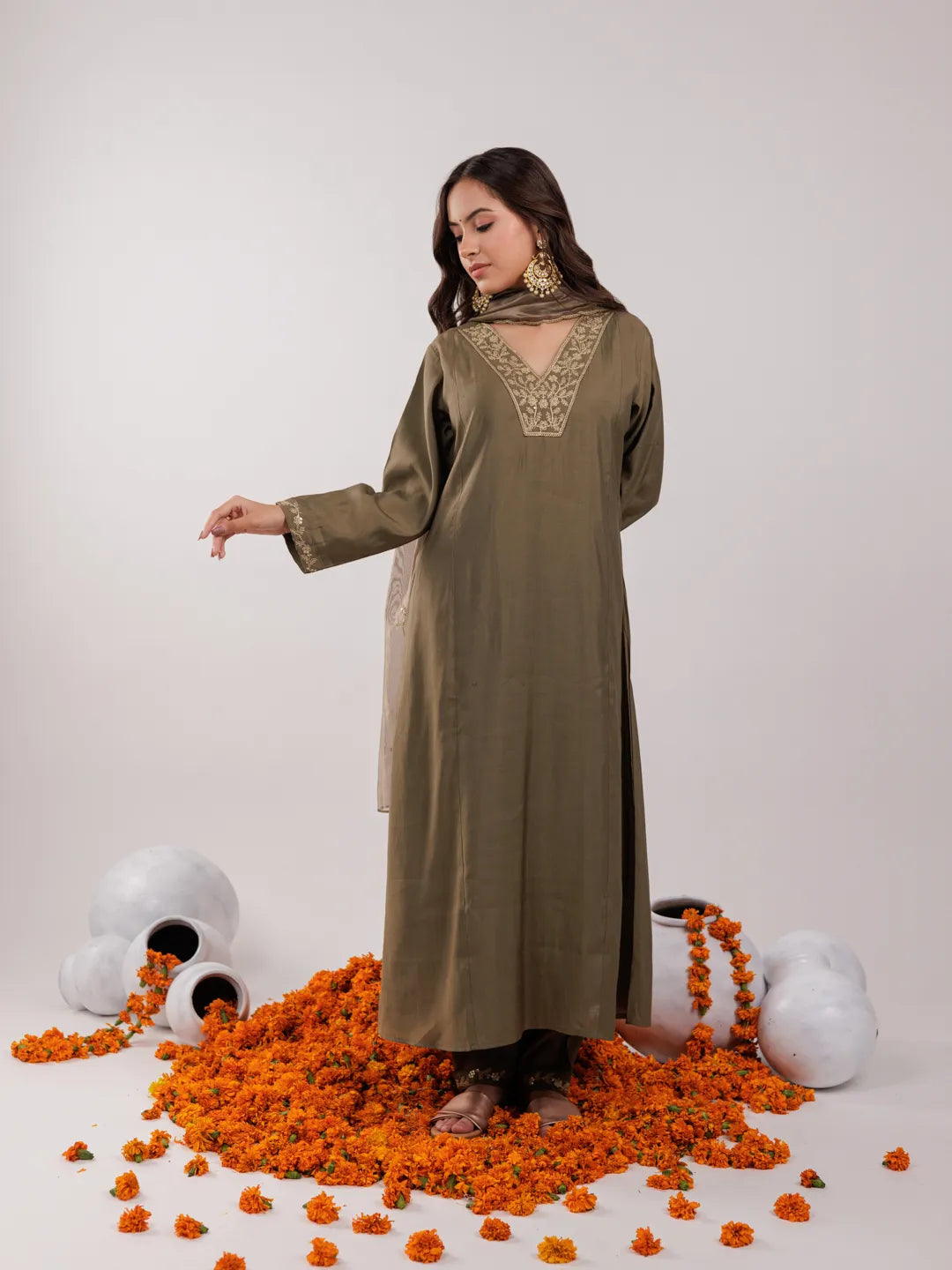 Olive Green Silk Embroidered Kurta Dupatta Set