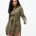 Olive Shirt Dress, in Cotton Twill fabric, Unlined, Knee Length, Comfort Fit, Button Closure, Straight Hemline and features Self Fabric Be;t At Wiast