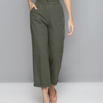 Olive Twill Straight Pants , in Cotton Twill fabric, Unlined, Ankle Length, Comfort Fit, Zipper Closure, Straight Hemline and features Roll - Up Detail At Bottom