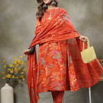 Orange Sequins Work Pure Cotton A-Line Kurta Trouser Dupatta Set