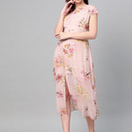 Peach Floral Back Cut Out Dress, in Weightless Georgette fabric, Polyester Lining, Midi Length, A Line, Zipper Closure, Straight Hemline and features Cut Out Detail At Back