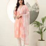 Peach Paisley Lace Work Straight Kurta Trouser Dupatta Set