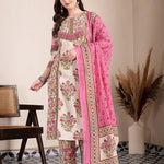 Pink And Beige Pure Cotton Floral Sequins Work Kurta Dupatta Set