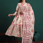 Pink And Cream Floral Print A-line kurta Trouser Dupatta Set
