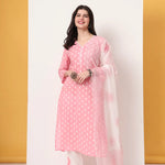 Pink Ethnic motifs Straight kurta Trouser Dupatta Set, Kurta Design Ethnic motifs,Lace_Work Straight Shape Three quarter Regular Sleeves V-Neck Calf Length Kurta Straight Hem Pure Cotton Machine Weave Fabric Trouser Design: White Solid one pocket Pure Cotton Trouser Slip-On Waist Size & Fit Material & Care Pure Cotton Dry Clean